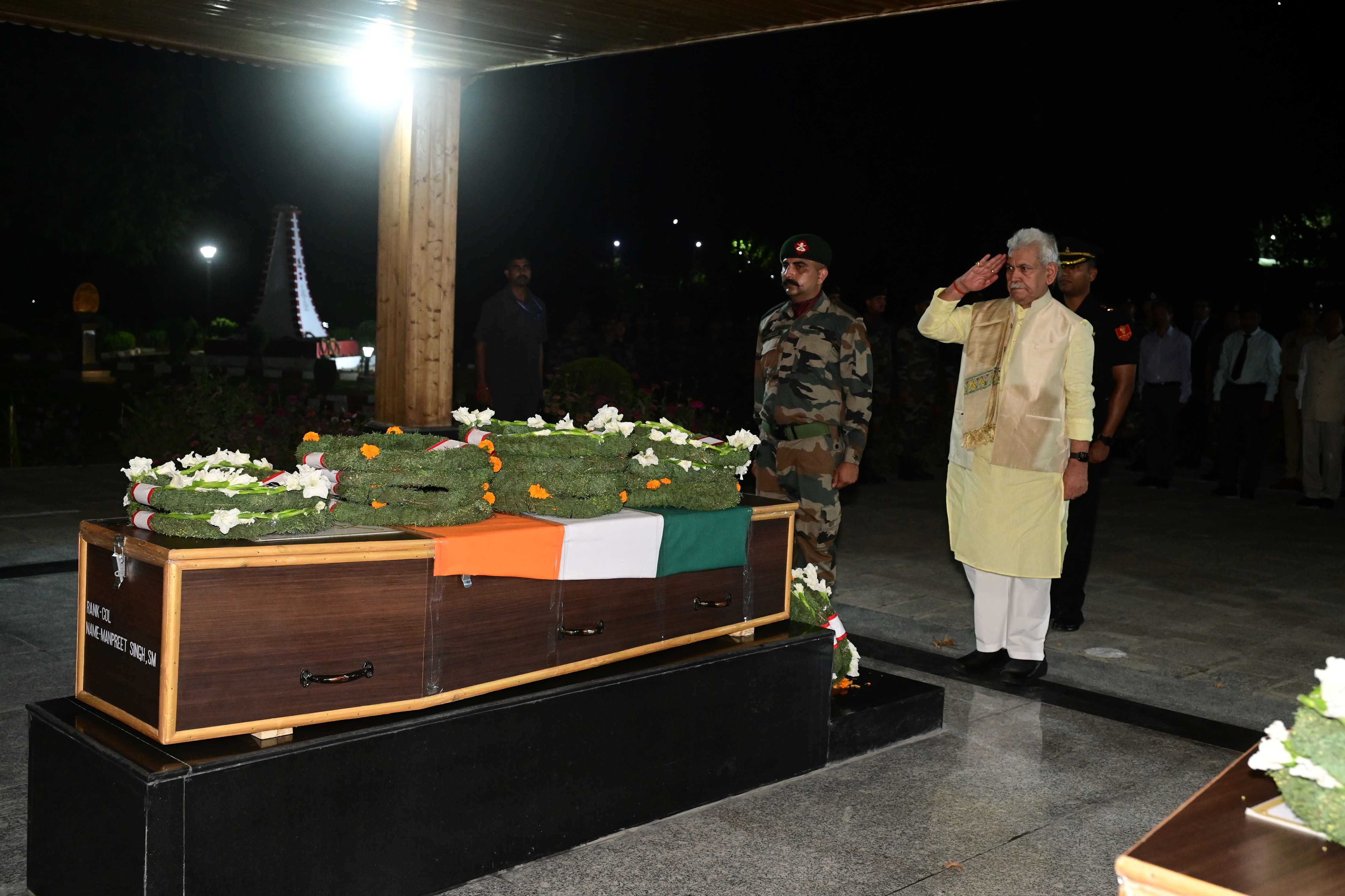i Manoj Sinha, Hon'ble LG of J&K and Lt Gen Rajiv Ghai, Chinar Corps Cdr along with Chief Secy J&K, Security Advisor to LG, DGP J&K and numerous other dignitaries have laid wreaths to pay homage to the Bravehearts today in a solemn ceremony at BB Cantt. The mortal remains of Late Col Manpreet Singh and Late Maj Aashish Dhonchak have been transported by a special aircraft for last rites to their native hometowns where they would be laid to rest with full military honours. In this hour of grief, the Indian Army stands in solidarity with the bereaved families and remains committed to their dignity, safety and well being.