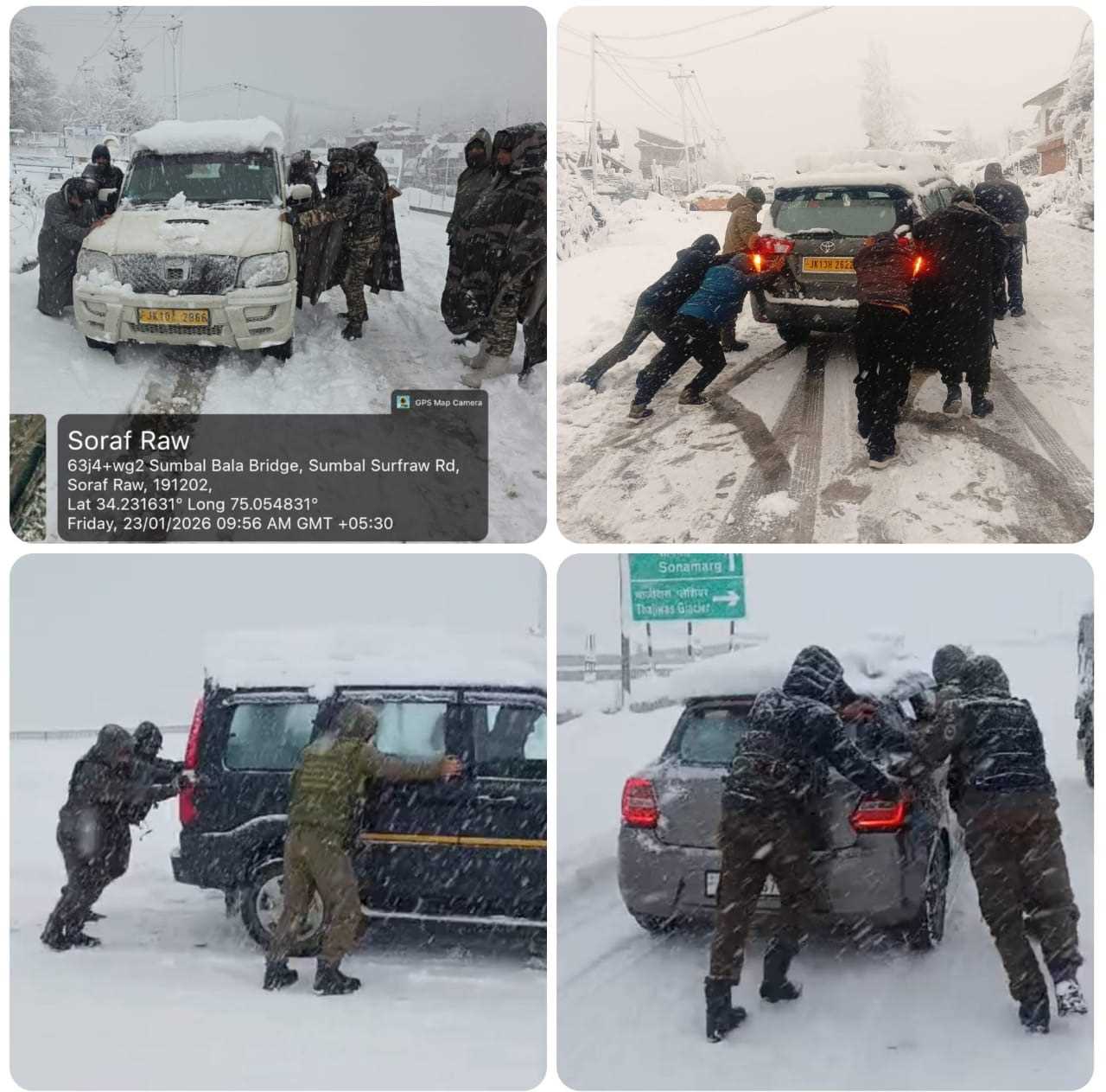 Rajouri, Jan 23: Heavy snowfall and continuous rainfall have severely disrupted normal life across the entire Pir Panjal region, leading to the closure of several vital roads and highways.Major roads rendered inaccessible include the Thannamandi–DKG–Bufliaz Road, Alal Road, Dara Road, and multiple interior and link roads in the Koteranka and Budhal areas, causing widespread inconvenience to commuters and residents.The Jammu–Poonch National Highway (NH-144A) also remained closed at Tota Gali due to nearly two feet of accumulated snow, resulting in a large number of stranded buses, trucks, and private vehicles.Responding swiftly to the developing situation, the Indian Army’s Romeo Force (RR) launched prompt relief operations and provided assistance to around 110 stranded civilians. The Army personnel distributed hot food, tea, and warm clothing, with special care extended to children and vulnerable individuals.To restore traffic movement and ensure public safety, JCB machinery was requisitioned and deployed for snow clearance and effective traffic management. The timely intervention by the Army ensured the safety of civilians and significantly alleviated hardship during the severe weather conditions.The Indian Army, particularly the Romeo Force, once again demonstrated its commitment to the welfare of the local population by bridging critical gaps during emergencies, while continuing to maintain robust security and humanitarian support in the border districts of Rajouri and Poonch.