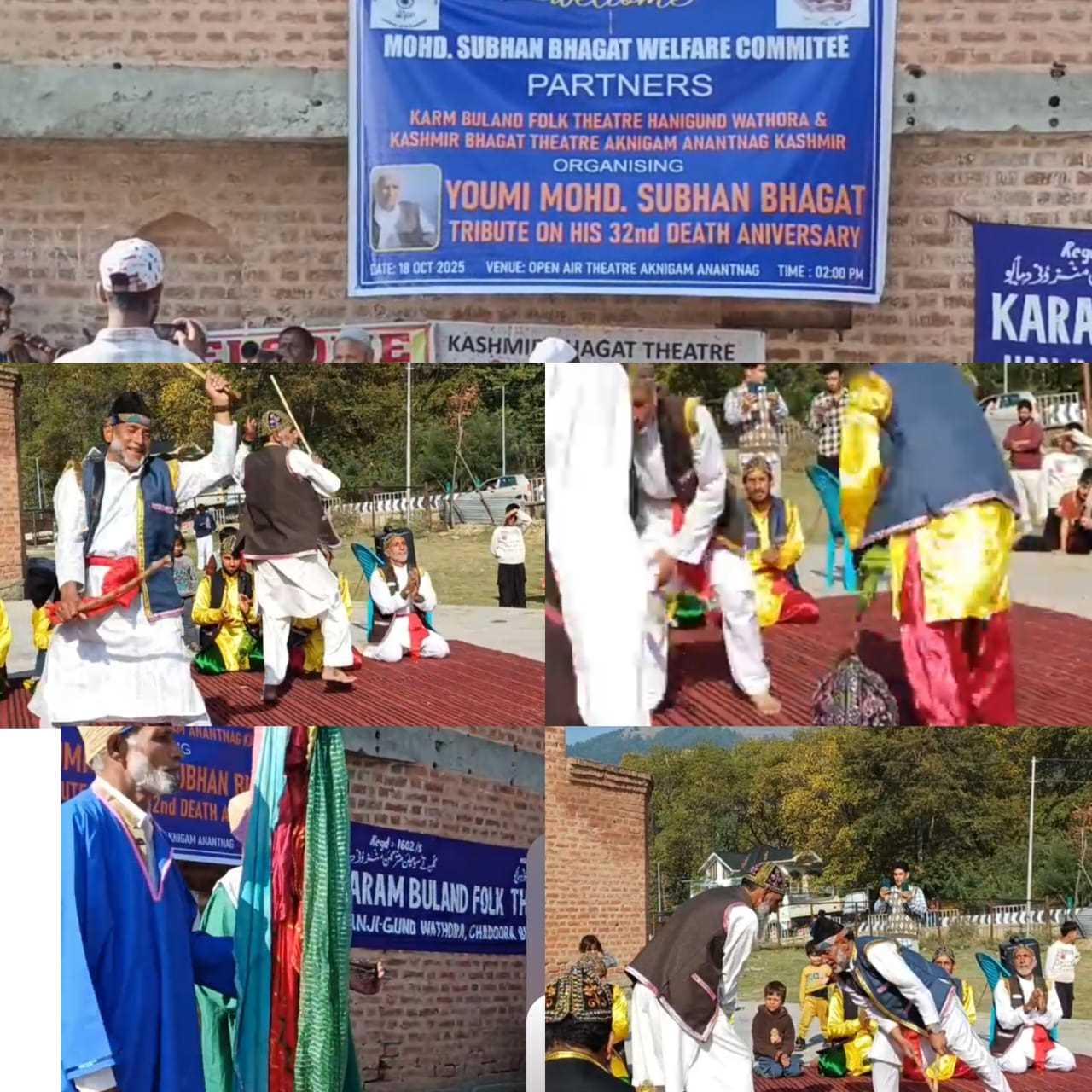 The Cultural Wing of the Department of Information and Public Relations (DIPR), in collaboration with Karam Buland Folk Theatre Handgun and Kashmir Bhagat Theatre Akingam, today organized a cultural event “Youmi Mohd Subhan Baghat” at the Open Air Theatre, Akingam (Anantnag) to commemorate the 32nd death anniversary of the legendary folk artist Mohammad Subhan Baghat.