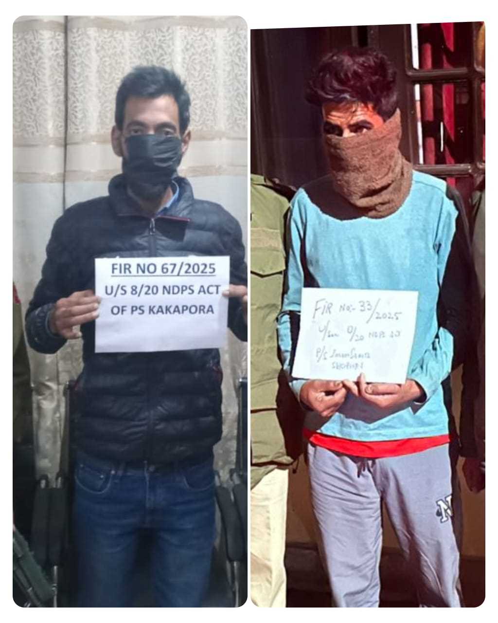 In a significant action against drug menace, J&K Police arrested 02 drug peddlers in Pulwama & Shopian and recovered contraband substances from their possession.