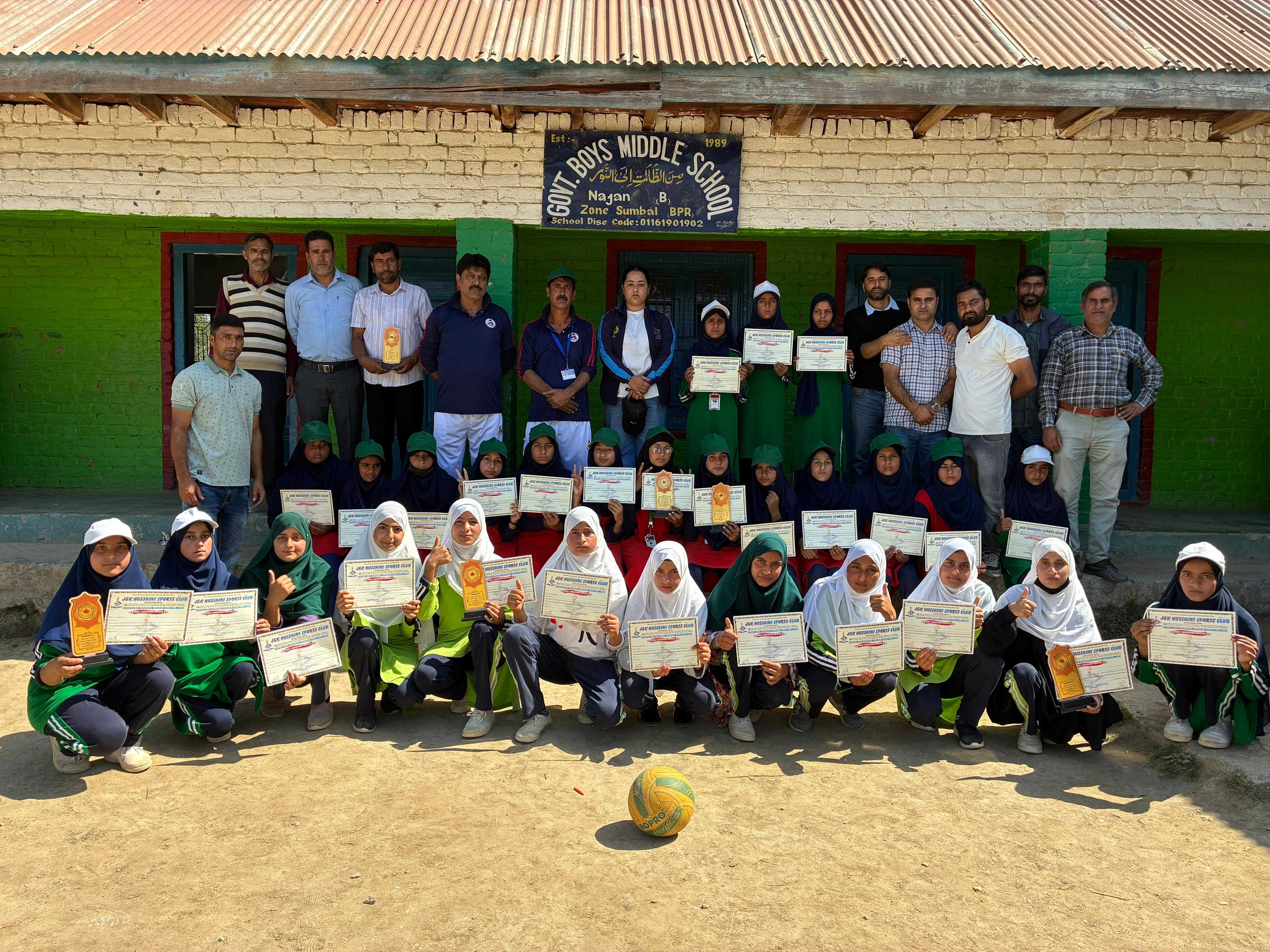 The concluding ceremony was graced by Sahil Ali (Secretary, J&K 7-Side Throwball Association), Sadiya Fayaz (Throwball Coach), Bashir Ahmad (HM, MS Najan B), Raja Bashir (HM, MS Abadpora), and Ishtiyaq Ahmad (HM, MS Checkpora), who distributed participation certificates to all athletes.