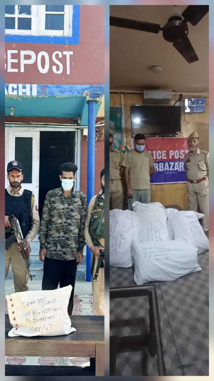 Meanwhile, acting on specific input, a police team from Police Post Wachi Shopian at a checkpoint established at Darbagh Wachi intercepted a suspicious person identified as Imtiyaz Ahmad Dar son of Ali Mohd Dar resident of Darbagh Wachi. During search, 2.4 Kgs of Charas sticks were recovered from his possession. Accordingly, a case vide FIR No. 75/2025 under relevant sections of the law has been registered at Police Station Zainapora.