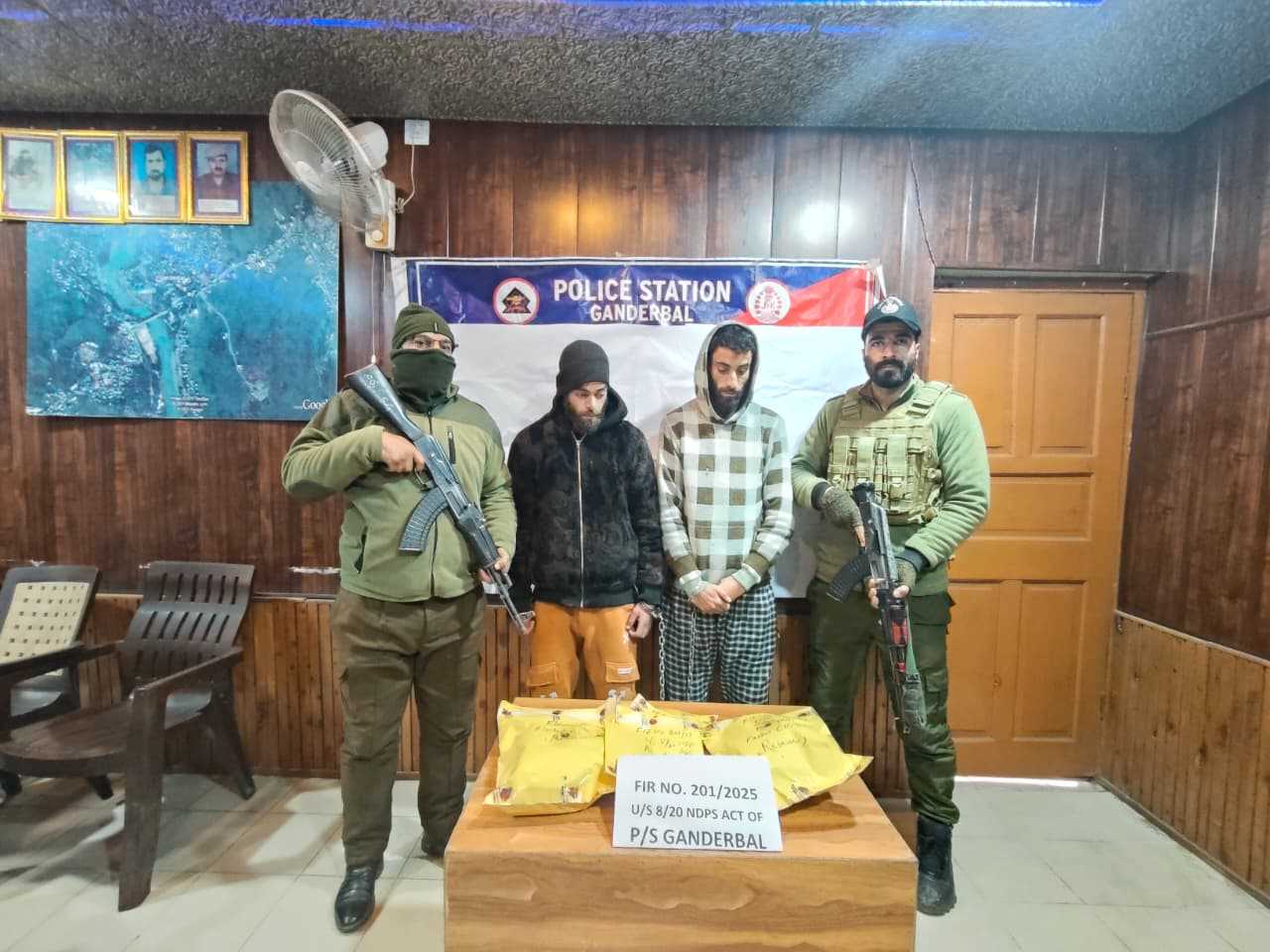 In a swift and well-coordinated operation, on the directions of SSP Ganderbal Shri Khalil Ahmad Poswal-JKPS, a police team from Police Station Ganderbal led by SHO PS Ganderbal at a checkpoint established at Tengpora Dhobipora intercepted and apprehended 02 persons. They have been identified as Aqib Rashid Bhat, son of Abdul Rashid Bhat, and Tasaduq Majeed Bhat, son of Abdul Majeed Bhat, both residents of Guzerbal, Ganderbal. Upon thorough search, police party recovered one bag from Aqib Rashid Bhat containing 1024 grams of bhangpatri (ganja-like substance) and 58 grams of charas-like substance. Moreover, another bag weighing 780 grams of bhangpatri (ganja-like substance) was recovered from Tasaduq Majeed Bhat.