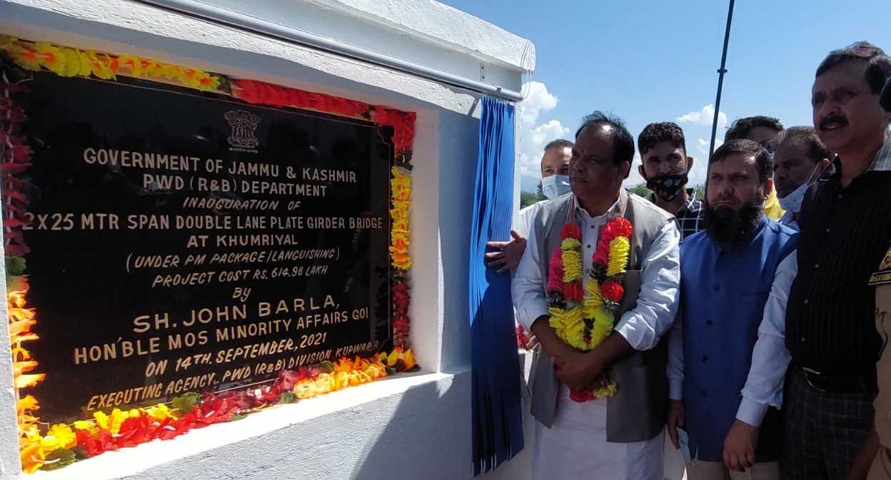 The Minister, who was on a two day visit to Kupwara district under union Government's public outreach programme, inaugurated Double Lane Bridge at Khumriyal in Kupwara district. The bridge costing Rs.614.98 lakh connects Lolab Valley, with the rest of the district.