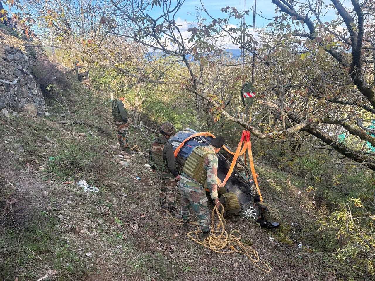 Around 04:45 PM, Maruti Baleno enroute from Srinagar to Chowkibal, skidded off the road and plunged nearly 25 meters into the valley. On receiving information, troops from nearest Army unit from Niyari rushed to the site and mobilised resources to rescue the car. Troops promptly rescued the injured travellers, evacuated them to Karalpora Hospital and recovered the car using a 20 T heavy duty crane. Troops also ensured smooth traffic management throughout the rescue operation in coordination with local police to prevent inconvenience to the locals.