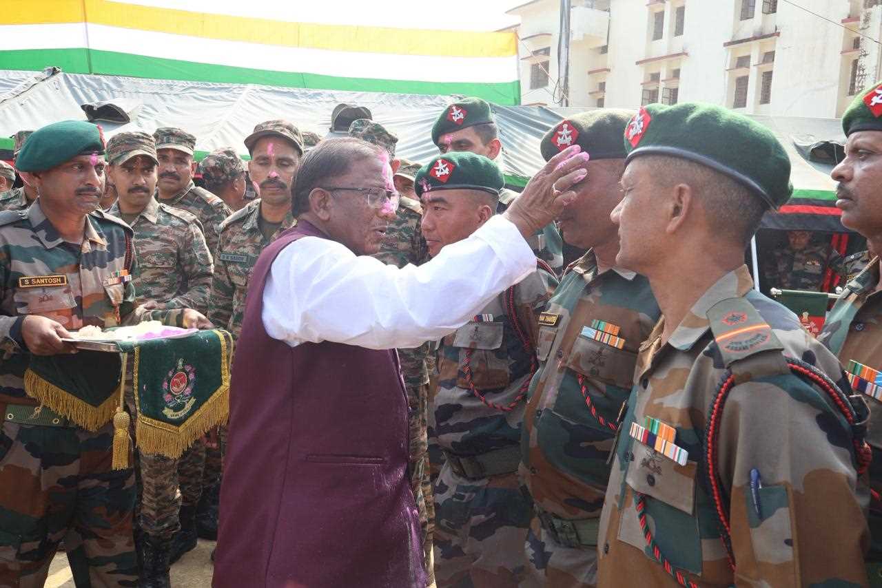 Dimapur, Mar 5: The Assam Rifles celebrated the festival of Holi with vibrant enthusiasm at HQ IGAR (East), Srikona, Silchar, in the presence of the Hon’ble Governor of Assam, Shri Lakshman Prasad Acharya. The occasion was marked by colorful festivities, cultural performances, and a spirit of camaraderie between the troops and the dignitary.