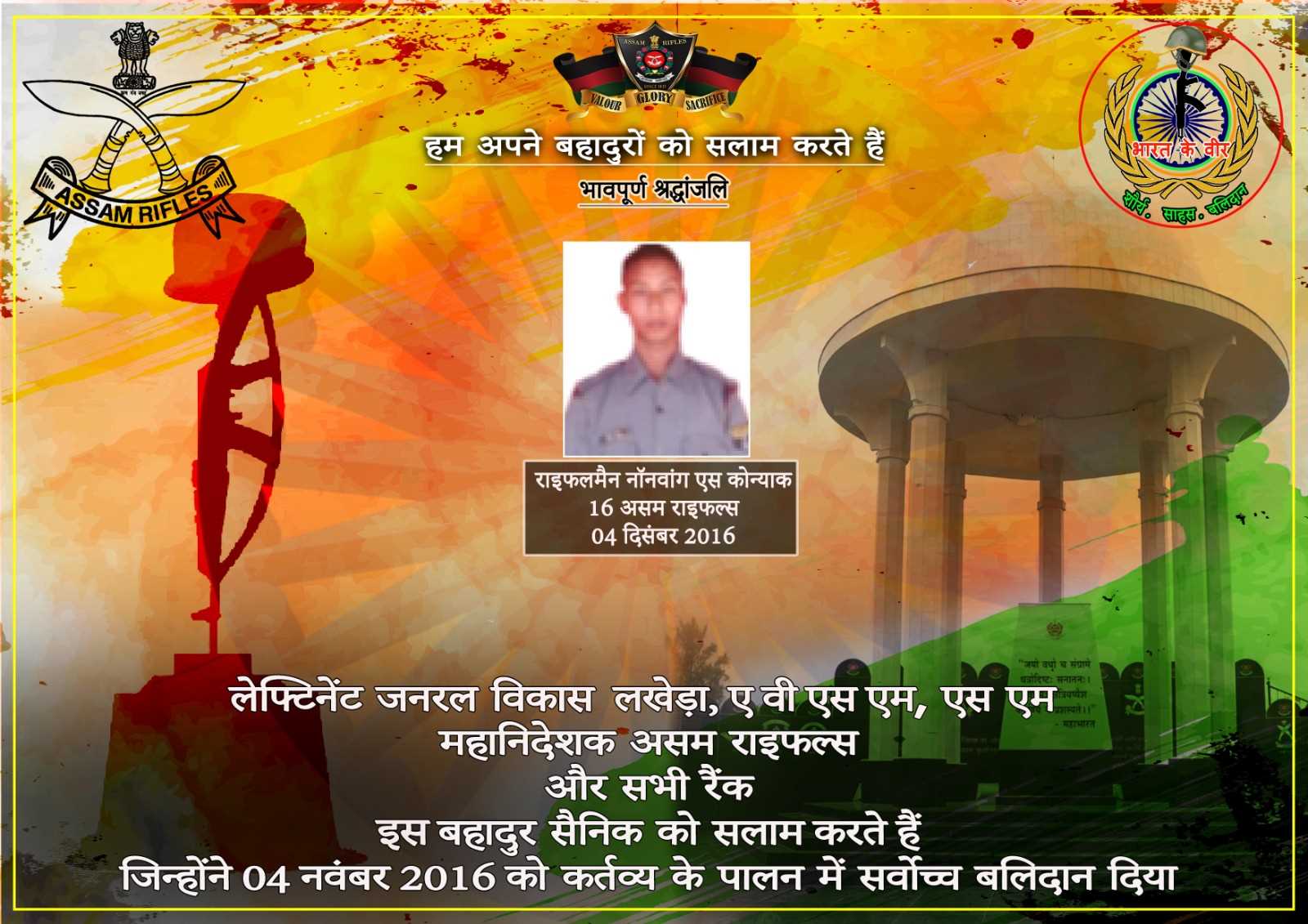 Tengnoupal, Dec 4: Lieutenant General Vikas Lakhera, AVSM, SM, Director General of Assam Rifles, along with all ranks, paid homage today to the valiant soldier who made the ultimate sacrifice in the line of duty on December 4, 2016.