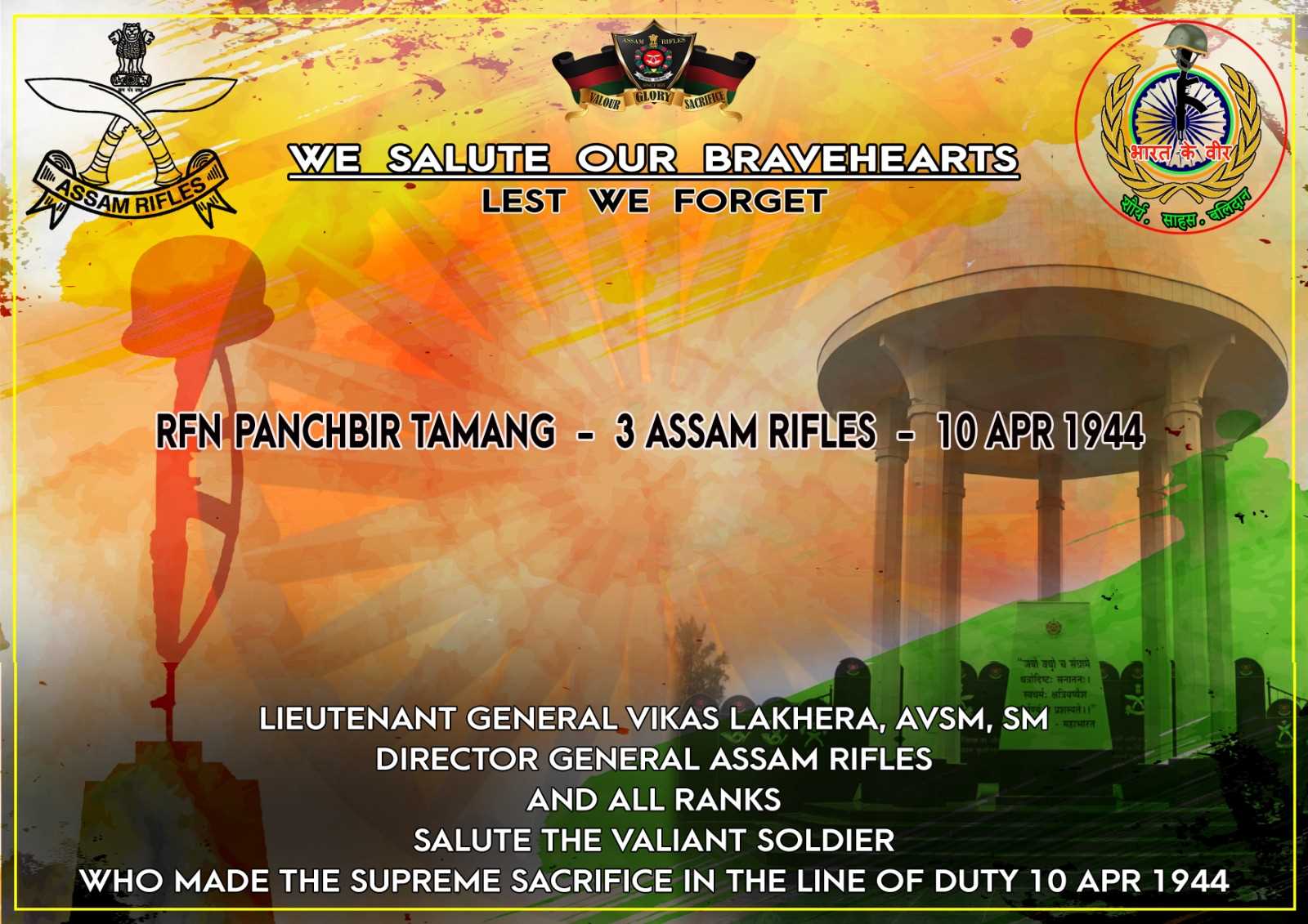 Kohima, April 10:Lieutenant General Vikas Lakhera, AVSM, SM, Director General of Assam Rifles, along with all ranks, paid solemn tribute to a brave soldier who made the supreme sacrifice in the line of duty on April 10, 1944.