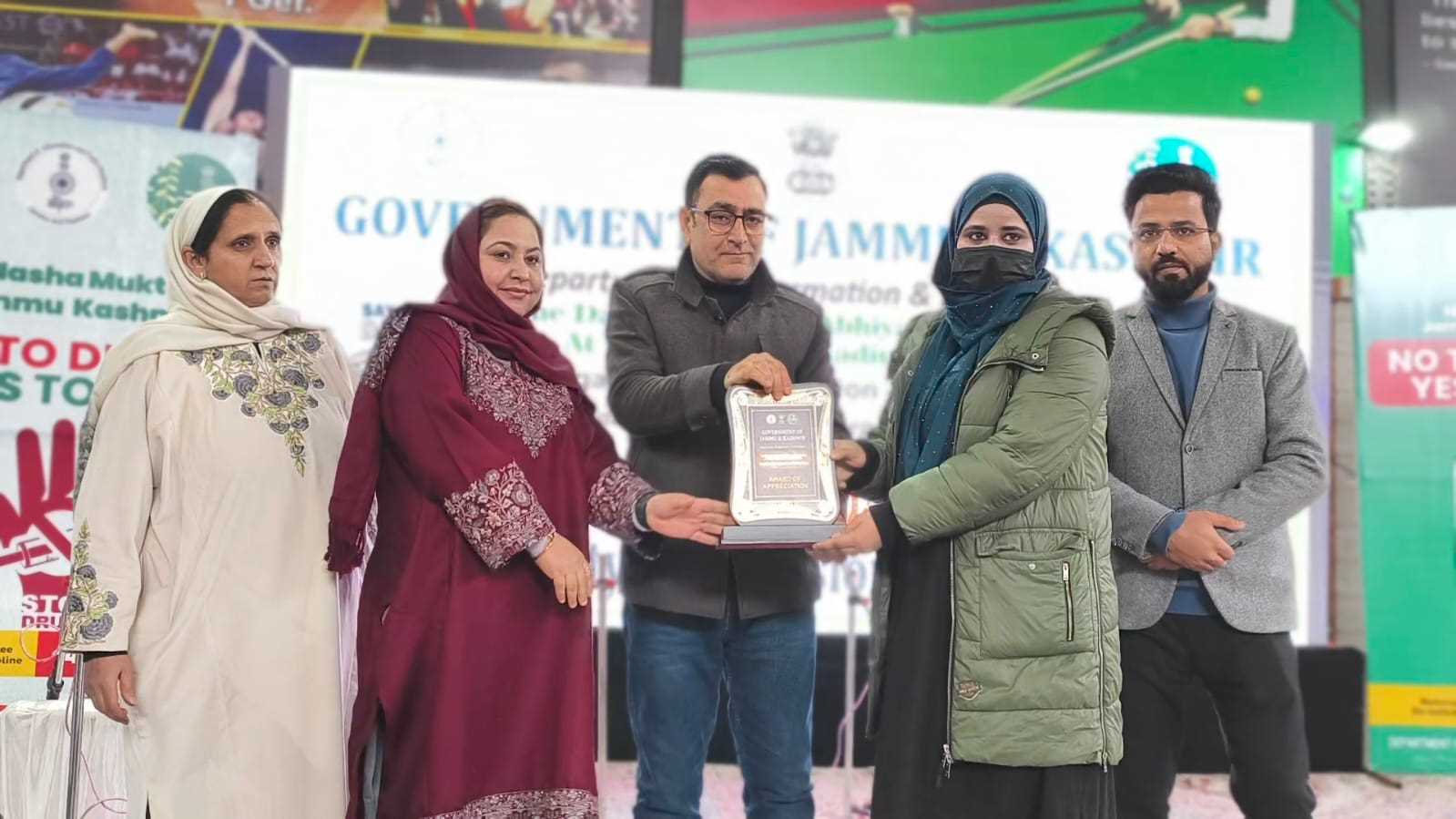 Brighter Kashmir Multimedia Head Shugfuta Rashid was felicitated by District Information Officer Iram Khan for her outstanding media coverage in promoting drug awareness in Kashmir.