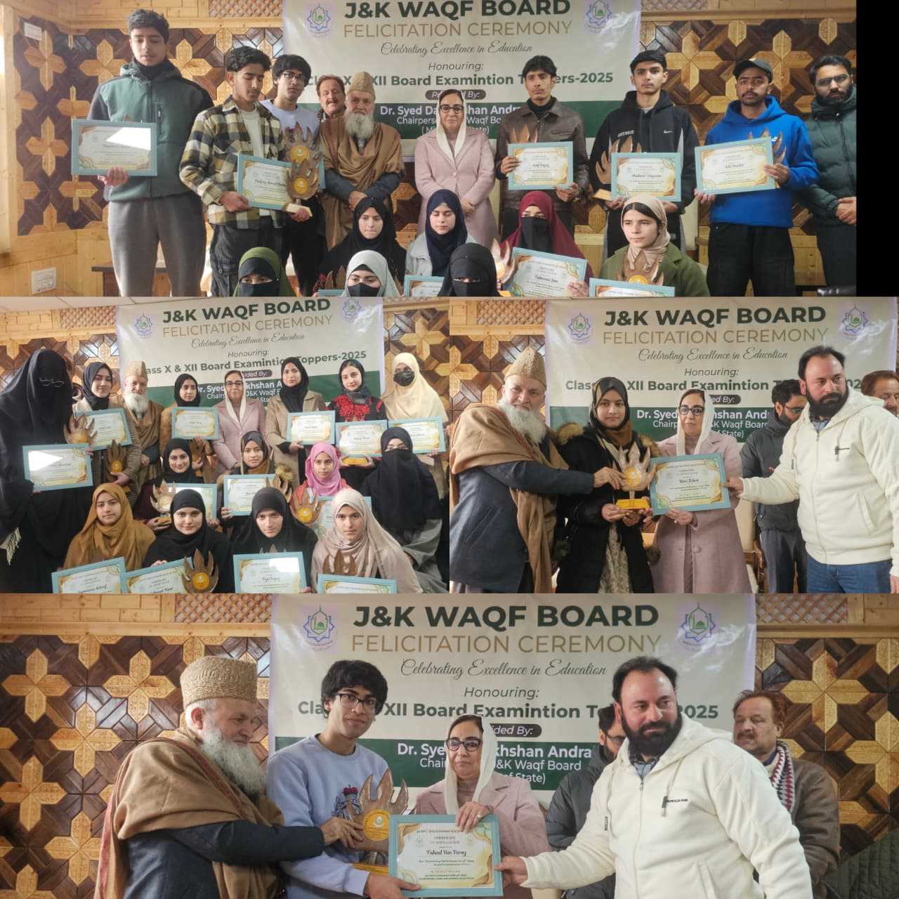 Jammu and Kashmir Waqf Board today organised a grand felicitation ceremony at Srinagar in which Chairperson of the Board Dr Syed Darakhshan Andrabi honoured thirty toppers from Waqf Board run schools from Kashmir division in the recently declared tenth and twelve class students of JKBOSE. Waqf Chairperson was accompanied by the Member of the Board Syed Mohammad Hussain and the Executive Magistrate Ishtiyaq Mohiuddin. The function was attended by the Principals and Administrators of educational institutions. The development report of the educational department in the Board was presented on the occasion. Dr Darakhshan Andrabi presented Momento’s and Certificates of Honour to the toppers. Later in her address she said that this extraordinary performance in the Board exams by the Waqf schools is the result of broader reforms of the Board in educational sector during the past three years. “We have worked very hard to create a positive environment in our educational institutions by reforms and infrastructural development and accountability mechanisms. Our teachers, management and students have worked hard and we are proud of them”, said Andrabi. She said that Waqf Board was the first organisation to implement National Education Policy in educational institutions. "The reforms resulted in increase of admissions in all schools during the past three years. From financial bankruptcy to stability, our schools became centres of excellence and we are committed to upgrade these institutions further in future", said Dr Darakhshan
