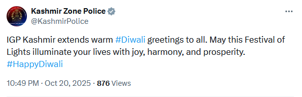 IGP Kashmir extends warm Diwali greetings to all. May this Festival of Lights illuminate your lives with joy, harmony, and prosperity. #HappyDiwali