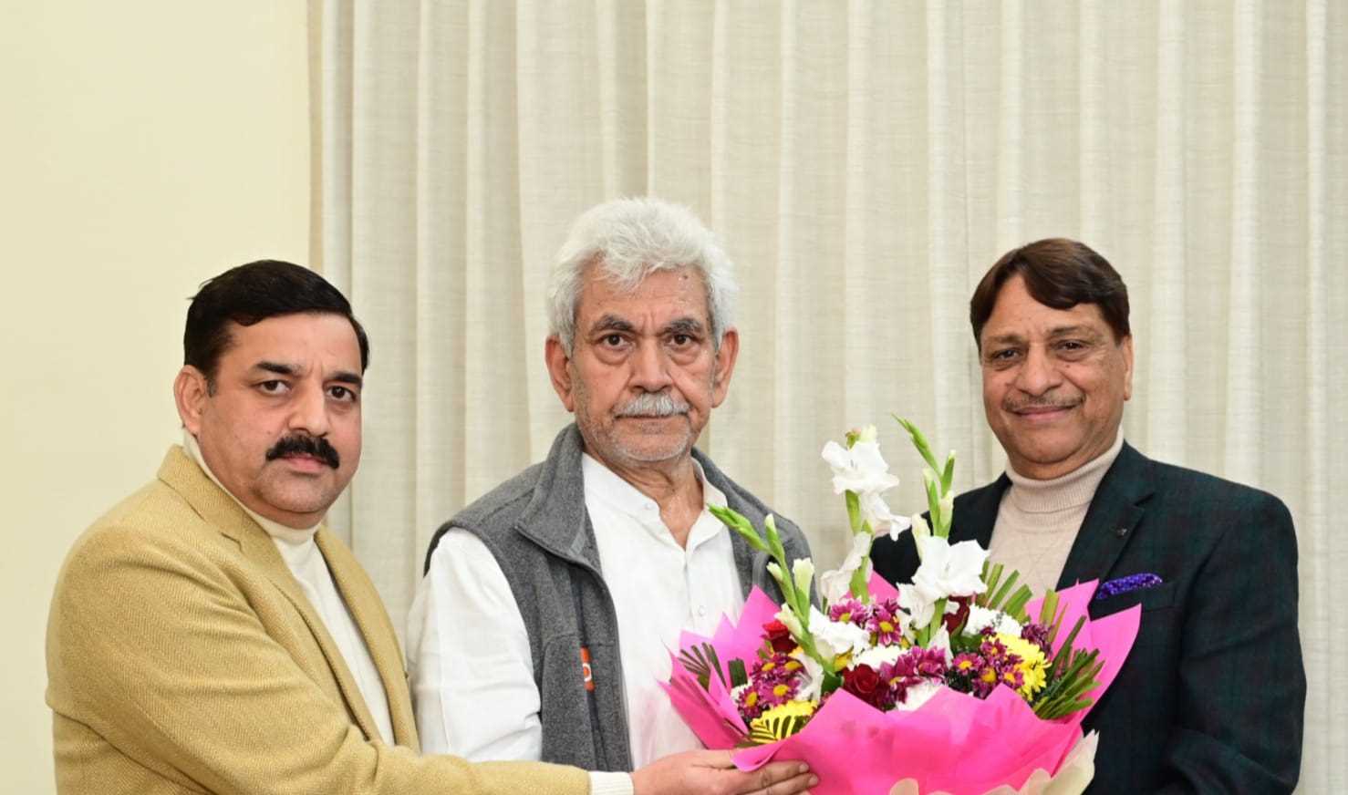 Baldev Raj Sharma, Member of Legislative Assembly, Shri Mata Vaishno Devi called on Lieutenant Governor Shri Manoj Sinha, today. He was accompanied by Shri Saraf Singh Nag, Chairperson District Development Council Reasi.