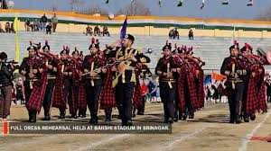 Srinagar, Jan 24:Ahead of the Republic Day celebrations, a full-scale dress rehearsal was conducted at Bakshi Stadium on Friday to review final arrangements.