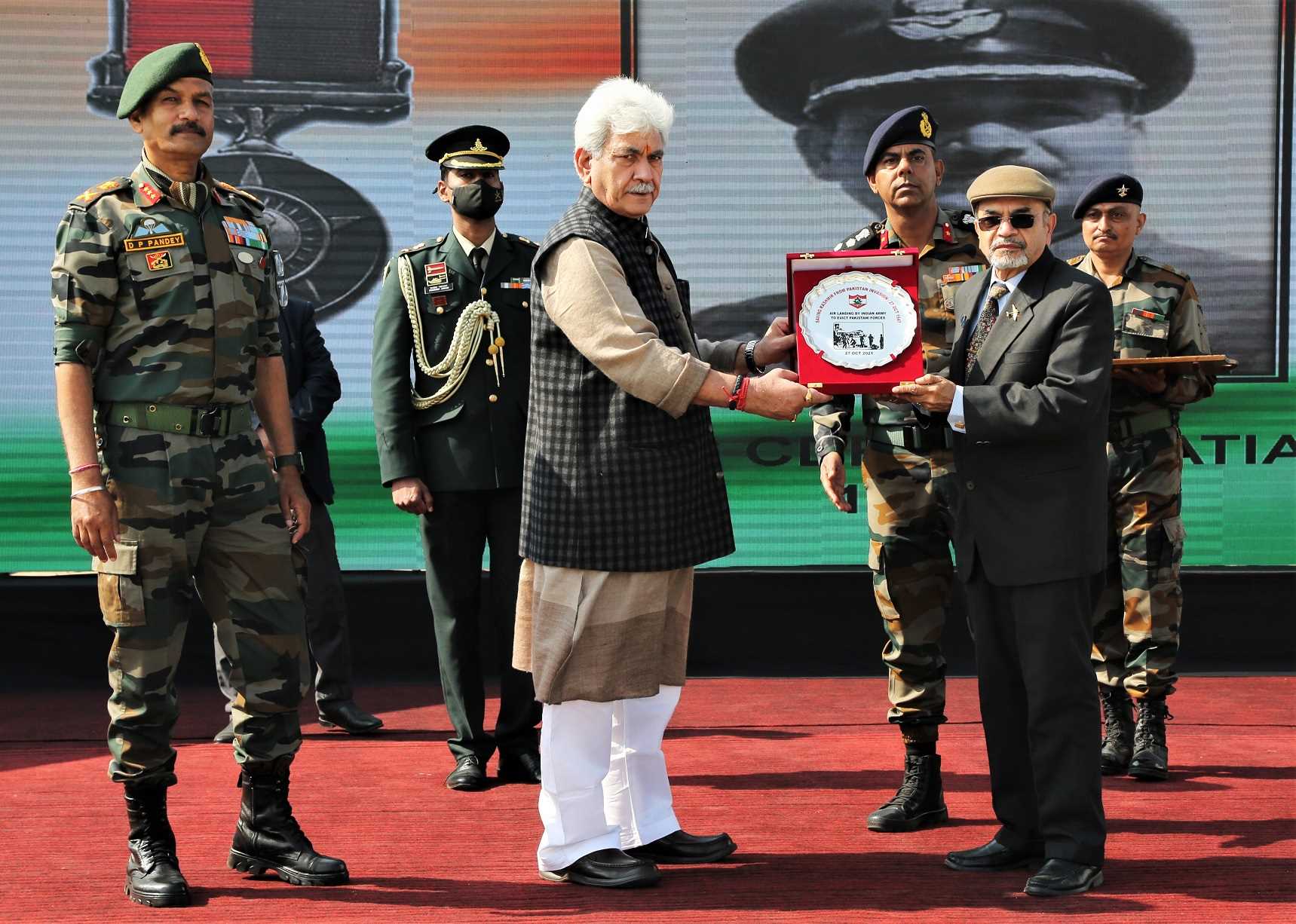 The re-enactment of the historic event was organised at Old Air Field, Srinagar, on 27 October 2021, to pay obeisance to the brave soldiers and people of Jammu & Kashmir who laid down their lives, and also to honour the next of kin of war heroes who participated in the 1947-48 War. The event was witnessed by the Lieutenant Governor of Jammu & Kashmir, Shri Manoj Sinha, Air Marshal Amit Dev, Air Officer Commanding-In-Chief, Western Air Command, Lieutenant General Devendra Pratap Pandey, General Officer Commanding 15 Corps along with several other civil and military dignitaries. In addition, the Next of Kin of war veterans who travelled across the country to be a part of this mega event were felicitated.