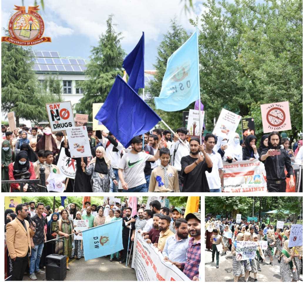 Students, faculty members and non-teaching staff of the University of Kashmir on Monday participated in large numbers in an anti-drug addiction rally organised to mark the International Day against Drug Abuse and Illicit Trafficking.
