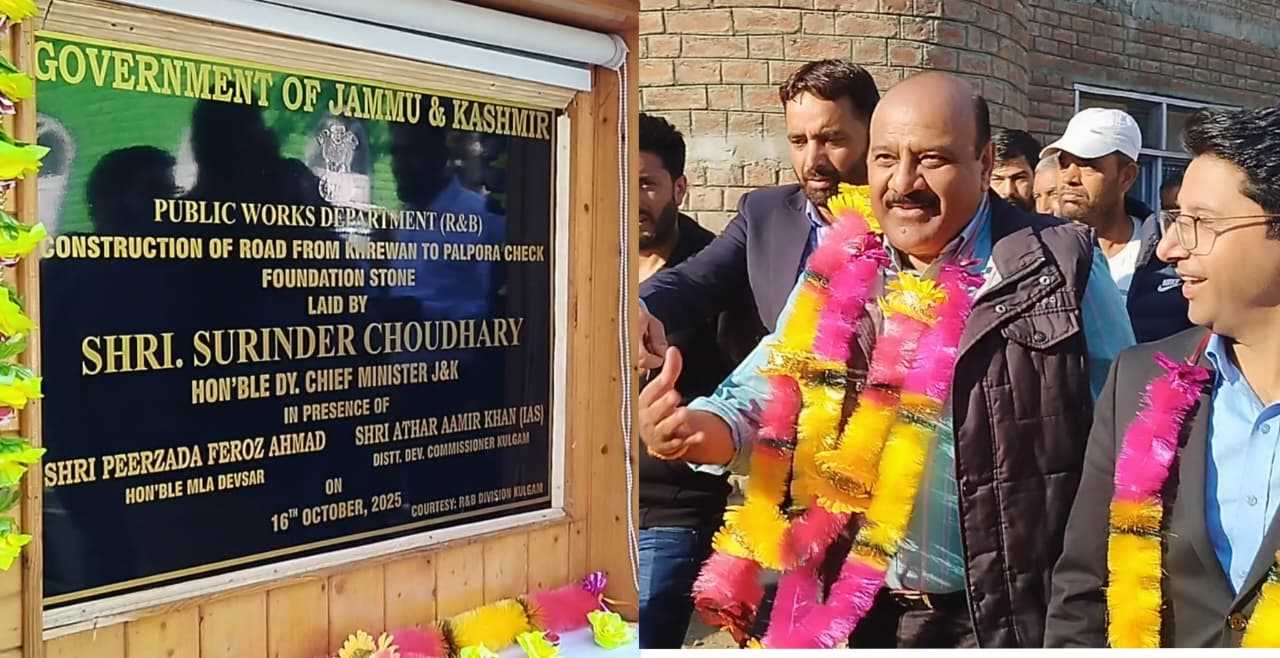 Later, the Deputy CM visited Kulgam district and laid the foundation stone for Rs. 5.69 crore Khrewan–Palpora Check Road construction project in Devsar Constituency. He said the road would benefit nearly 20 villages, enhancing road connectivity and easing transportation for local residents.