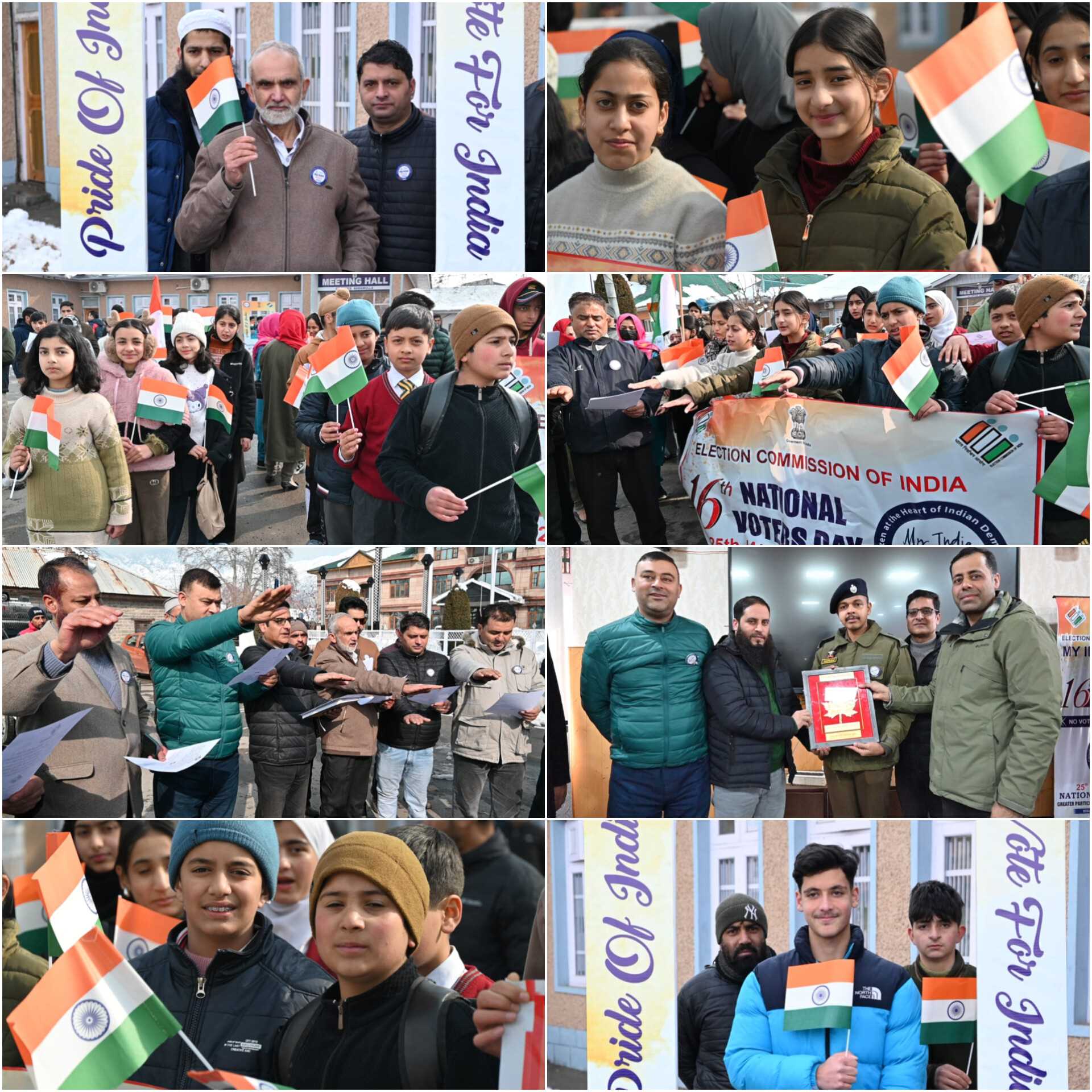 Bandipora held celebrations at N.M. Higher Secondary School, Kaloosa, with pledge ceremonies, cultural programs, EPIC distribution to new voters, and felicitation of BLOs and election officials. Events also took place in Sumbal and Gurez.