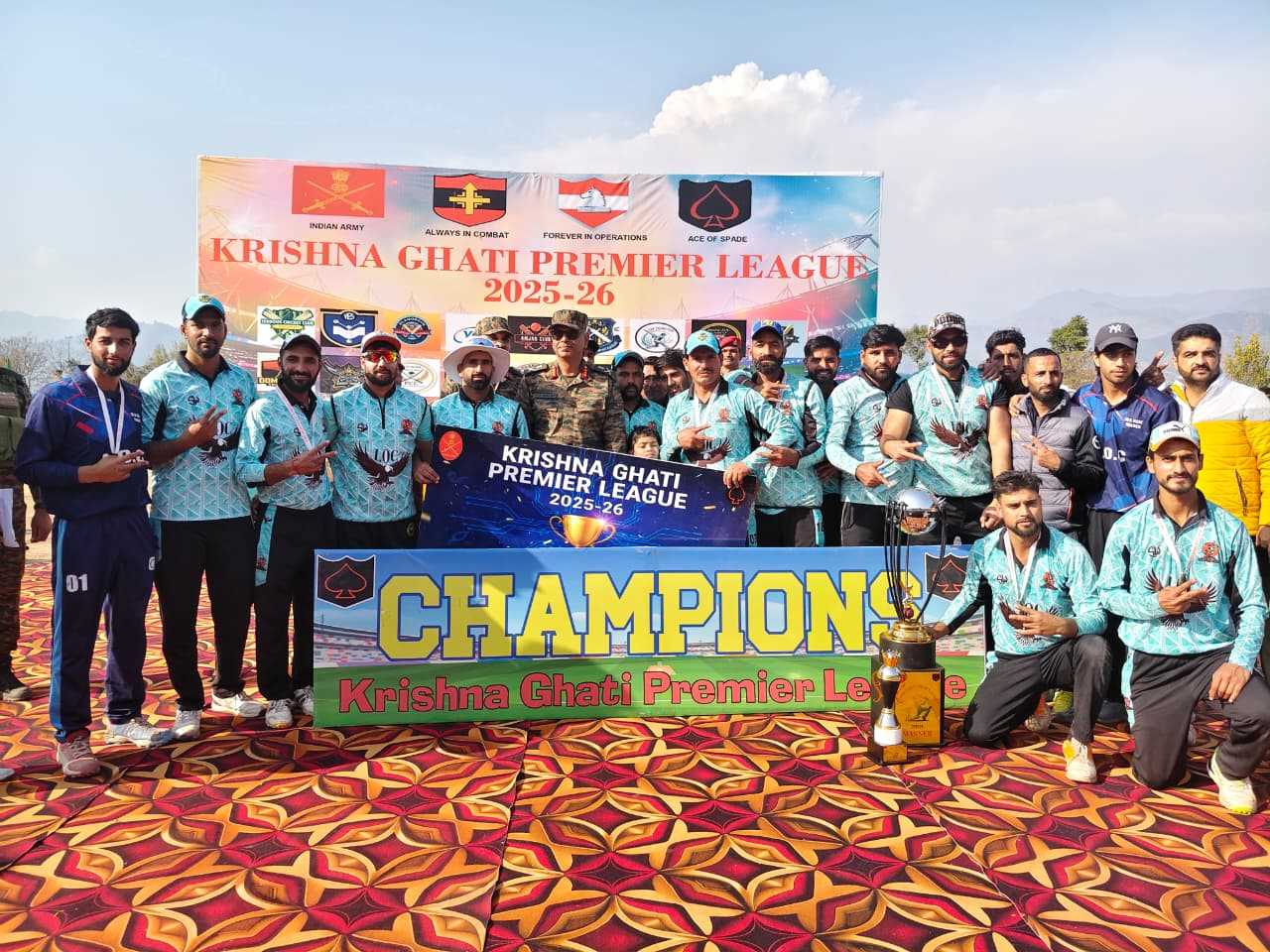 Poonch, Nov 22: The Krishna Ghati Brigade, under the aegis of the Ace of Spades Division, successfully concluded the Krishna Ghati Premier League (KGPL) 2025-26 with a spectacular grand finale and closing ceremony at the Sports Ground, Jhullas. Held from 02 to 21 November 2025, the tournament saw enthusiastic participation from 26 teams across Poonch, Mendhar, Surankote and Mandi, making it one of the most prominent sporting events in the region The grand finale was graced by the General Officer Commanding, White Knight Corps, Lieutenant General P.K. Mishra, who attended the event as the Chief Guest. He praised the initiative of the Krishna Ghati Brigade in creating a disciplined and professional sports platform for border-area youth. Highlighting the power of sports in instilling discipline, teamwork and leadership, Lt Gen Mishra urged youngsters to stay committed to constructive pathways and contribute to building a drug-free society. He further stressed that events like KGPL play a crucial role in promoting national integration, unity and communal harmony in border regions Also present on the occasion was Brigadier Amit, Commander Krishna Ghati 10th Brigade, whose guidance and leadership played a pivotal role in the smooth conduct of KGPL 2025-26. He appreciated the overwhelming participation of young players and reaffirmed the Brigade’s commitment to providing meaningful opportunities for the youth to showcase their talent and stay engaged in positive, productive activities KGPL was conceptualised to cultivate a strong sporting culture in the border belt while deepening civil-military cooperation. With prizes worth ₹8 lakhs, the tournament encouraged broad participation and enhanced competitive spirit among players This season witnessed an extraordinary digital milestone, with over 13.52 crore online viewership through live-streaming and digital highlights. Player interviews, match analyses and social media outreach significantly amplified the visibility of local cricketing talent.