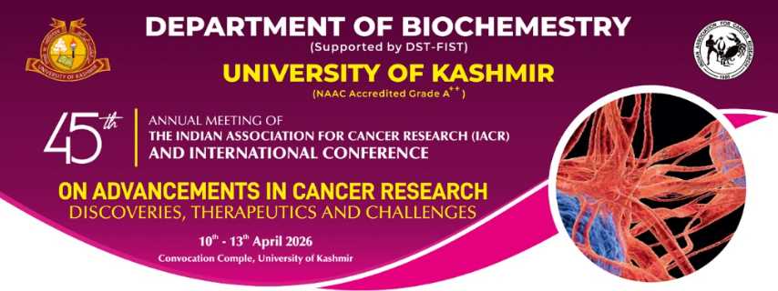 The Department of Biochemistry, University of Kashmir (KU), is set to host the 45th Annual Meeting of the Indian Association for Cancer Research (IACR) along with an international conference on “Advancements in Cancer Research: Discoveries, Therapeutics and Challenges” from April 10 to 13 at the varsity’s Convocation Complex at the Main Campus.