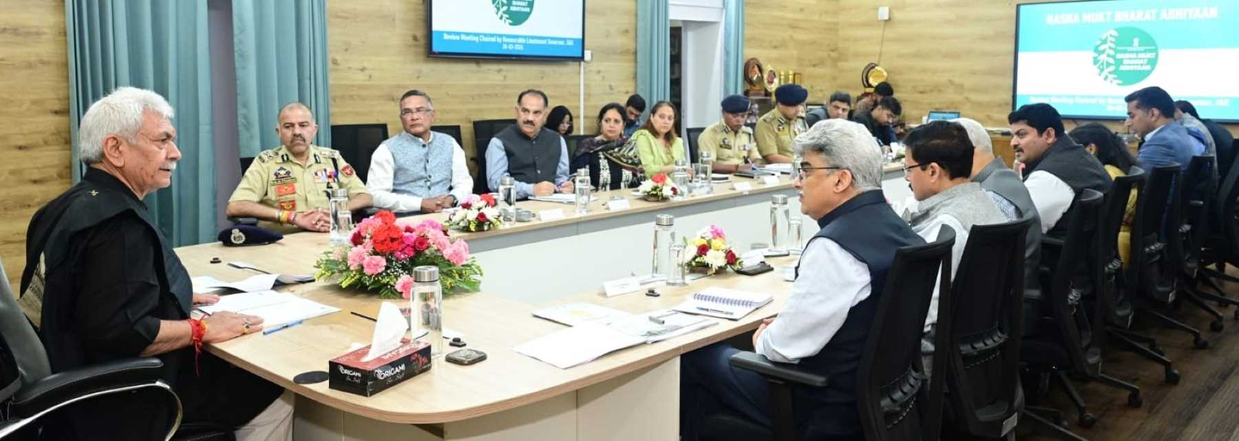 Sinha today reviewed the progress of Nasha Mukt Bharat Abhiyaan in the UT of Jammu Kashmir, at a high-level meeting at Lok Bhavan Jammu.