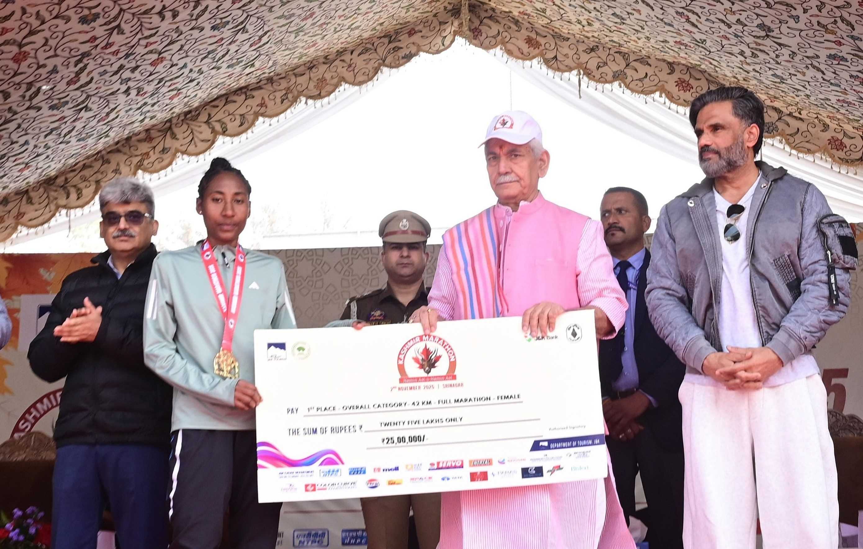 The Lieutenant Governor Shri Manoj Sinha felicitated the winners of Kashmir Marathon-2025 in Srinagar today. The Full & Half Marathon, 42 KMs and 21 KMs respectively, was organized by the J&K Tourism Department and 1100 runners from 27 States, Union Territories and 11 foreign countries participated in this mega international event in the Union Territory.