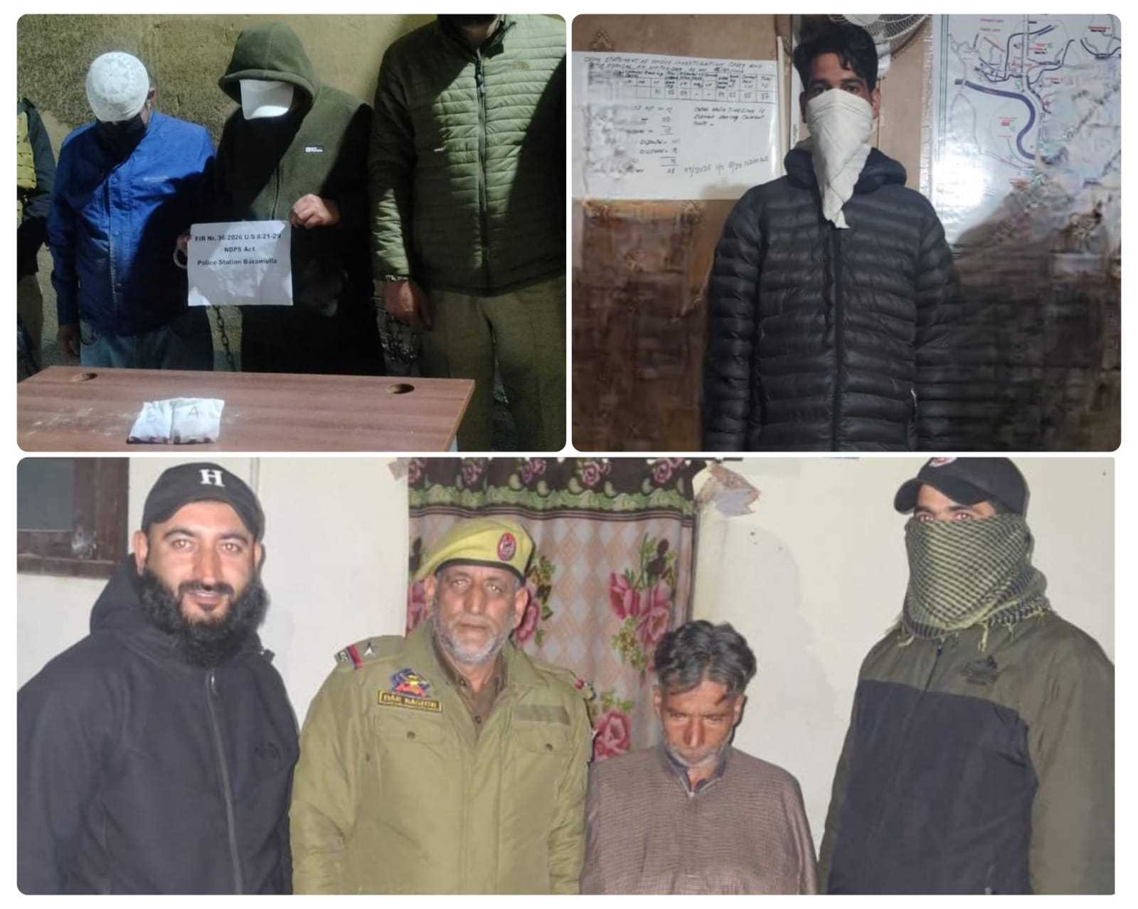 Srinagar, April 7: Continuing its sustained drive against the drug menace, Police have arrested four drug peddlers in Pulwama, Baramulla & Sopore and recovered contraband substances from their possession.