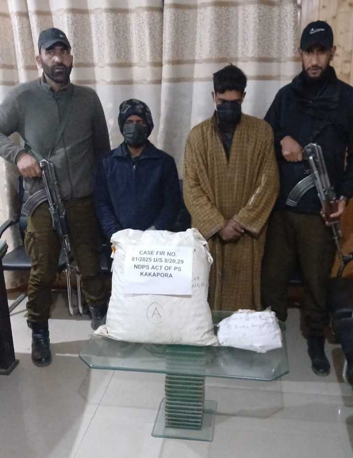A Police party during naka checking at Marvel near petrol pump noticed two suspicious persons, carrying a Nylon bag. On noticing the police party, both attempted to flee from the spot but were tactfully apprehended. During search, over 7 Kgs of semi-grinded cannabis-like substance was recovered from the nylon bag. They have been identified as Khursheed Ahmad Sofi son of Ab Gani Sofi resident of Brari Gund Budgam, A/P Lelhar Kakapora and Raju son of Ash Mohd resident of Shanti Badi Bagdi Para Road, Badartala, Kolkata, West Bengal. Both the accused have been arrested and shifted to police station where they remain in custody.