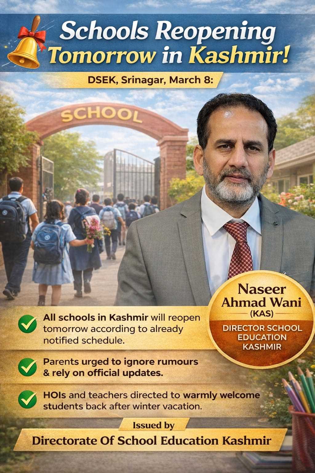 The institutions were closed last week as a precautionary measure amid protests reported in parts of Jammu and Kashmir following the killing of Iranian supreme leader Ayatollah Ali Khamnei in the joint US-Israeli air strike.