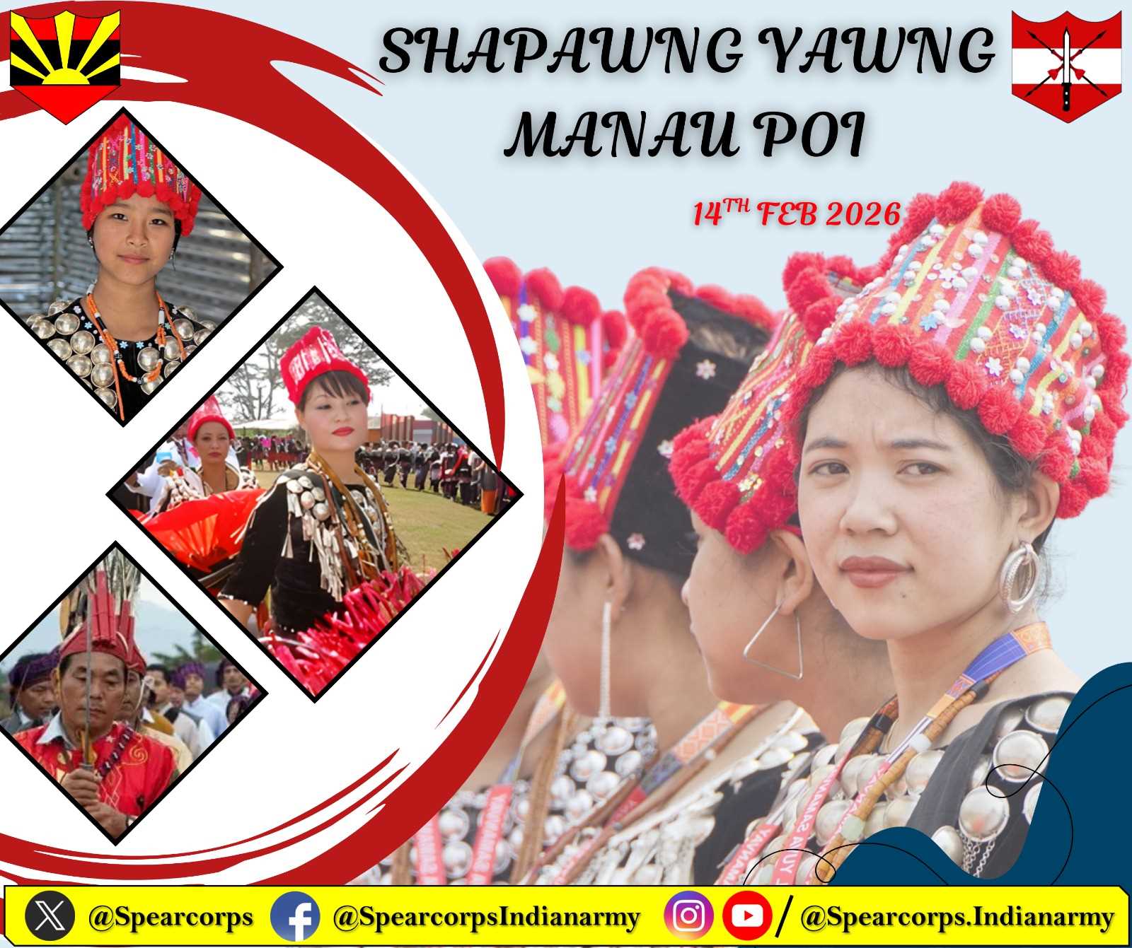 Itanagar,, Feb 14: Lieutenant General Abhijit S. Pendharkar, General Officer Commanding (GOC) of the Indian Army’s Spear Corps, along with all ranks, extended heartfelt greetings to the Singpho community and the people of Arunachal Pradesh on the occasion of Shapawng Yawng Manau Poi, one of the most significant cultural festivals of the region.