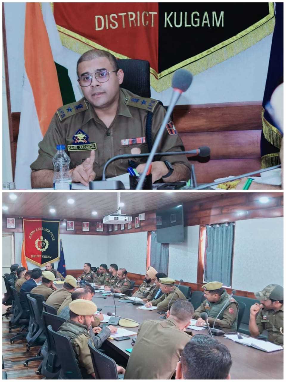 SSP Kulgam Shri Sahil Sarangal-IPS today chaired a crime/security review meeting at Conference Hall of DPO Kulgam. During the meeting, the status of under investigation cases related to ULAP(A), NDPS Act and crime against women & children were reviewed. Various security measures were discussed for ensuring peace and stability in the district.